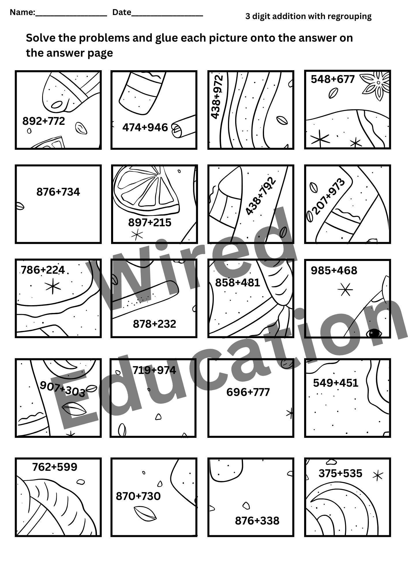 Solve the problems and stick the square onto the answer page completing a picture to colour in.